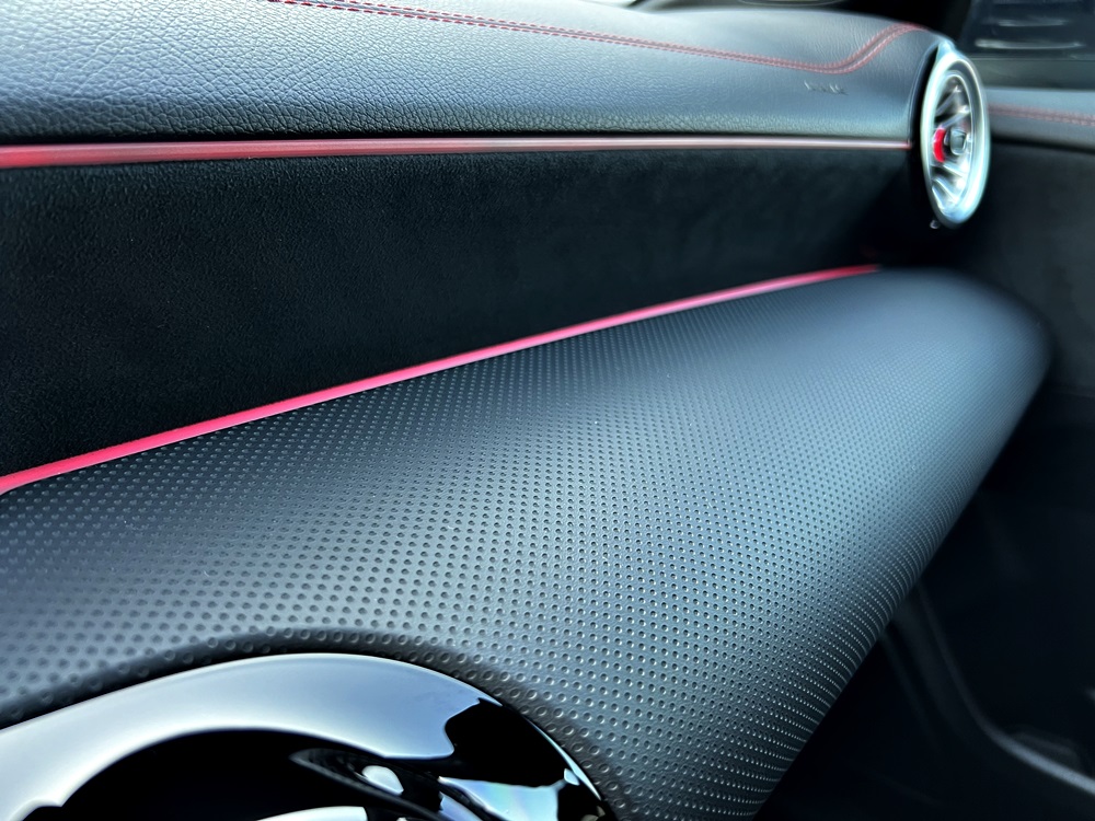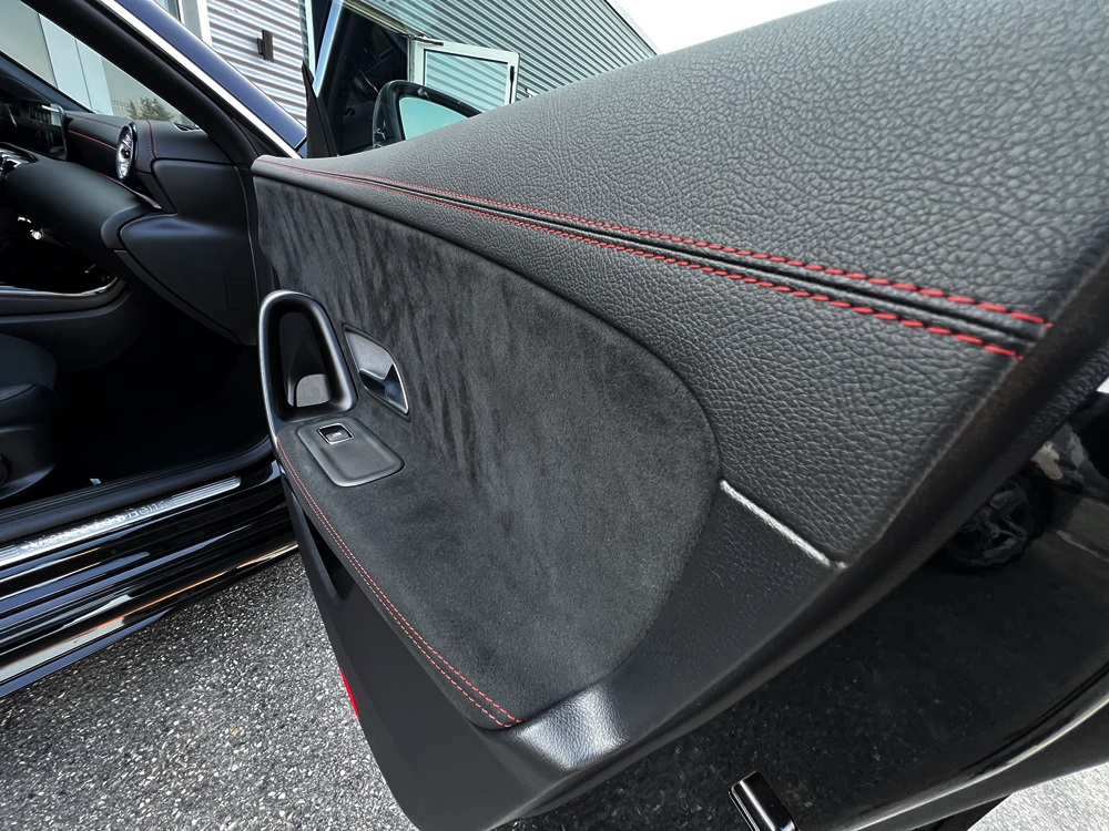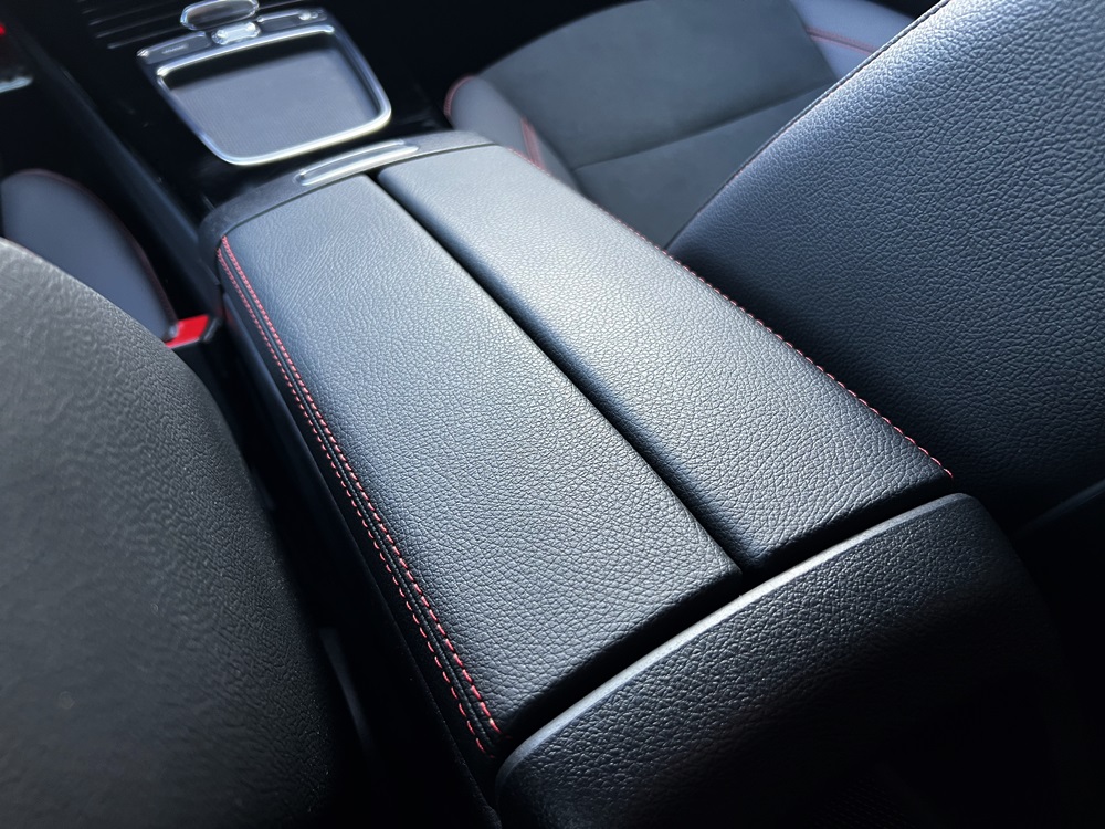Sellerie simili cuir & alcantara avec surpiqûres rouges,